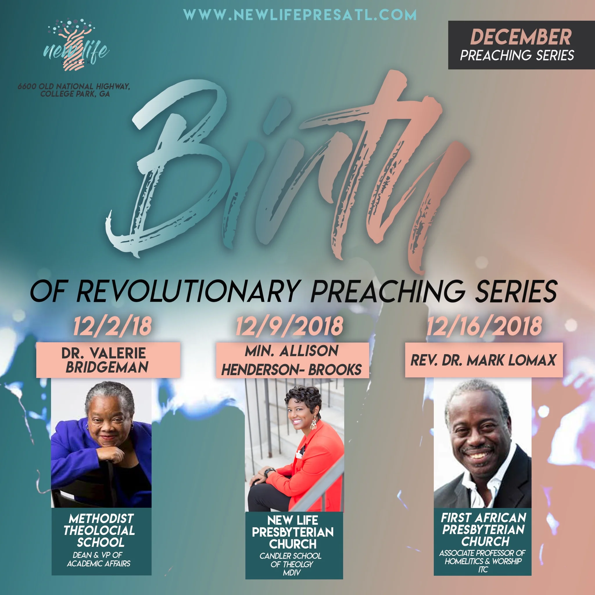 Sermon Series " The Birth of a Revolutionary" Sunday, December 16, 2018 10:30 AM 12:30 PM 10:30 12:30 Google Calendar ICS New Life Presbyterian Church6600 Old National HighwayCollege Park, GA 30349Rev. Hodari S. Williams, Pastor